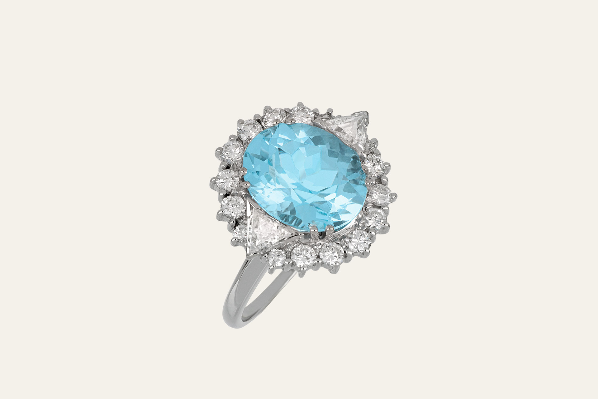 Un capolavoro di equilibrio e luce, dove la grazia classica incontra un’audace modernità. Al centro di questo anello in oro bianco risplende una magnifica acquamarina taglio ovale, scelta per il suo colore cristallino che evoca la purezza delle acque più limpide. Un contorno di diamanti taglio a brillante ne segue la silhouette, creando un alone di luce scintillante. L’elemento che rende unico questo design è la coppia di diamanti taglio a triangolo posta ai lati della pietra centrale: un dettaglio architettonico che dona carattere e un tocco contemporaneo al gioiello.