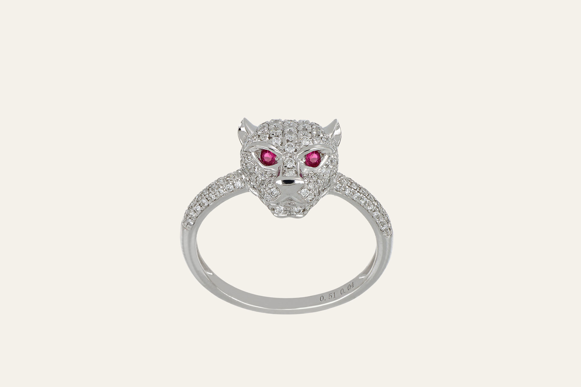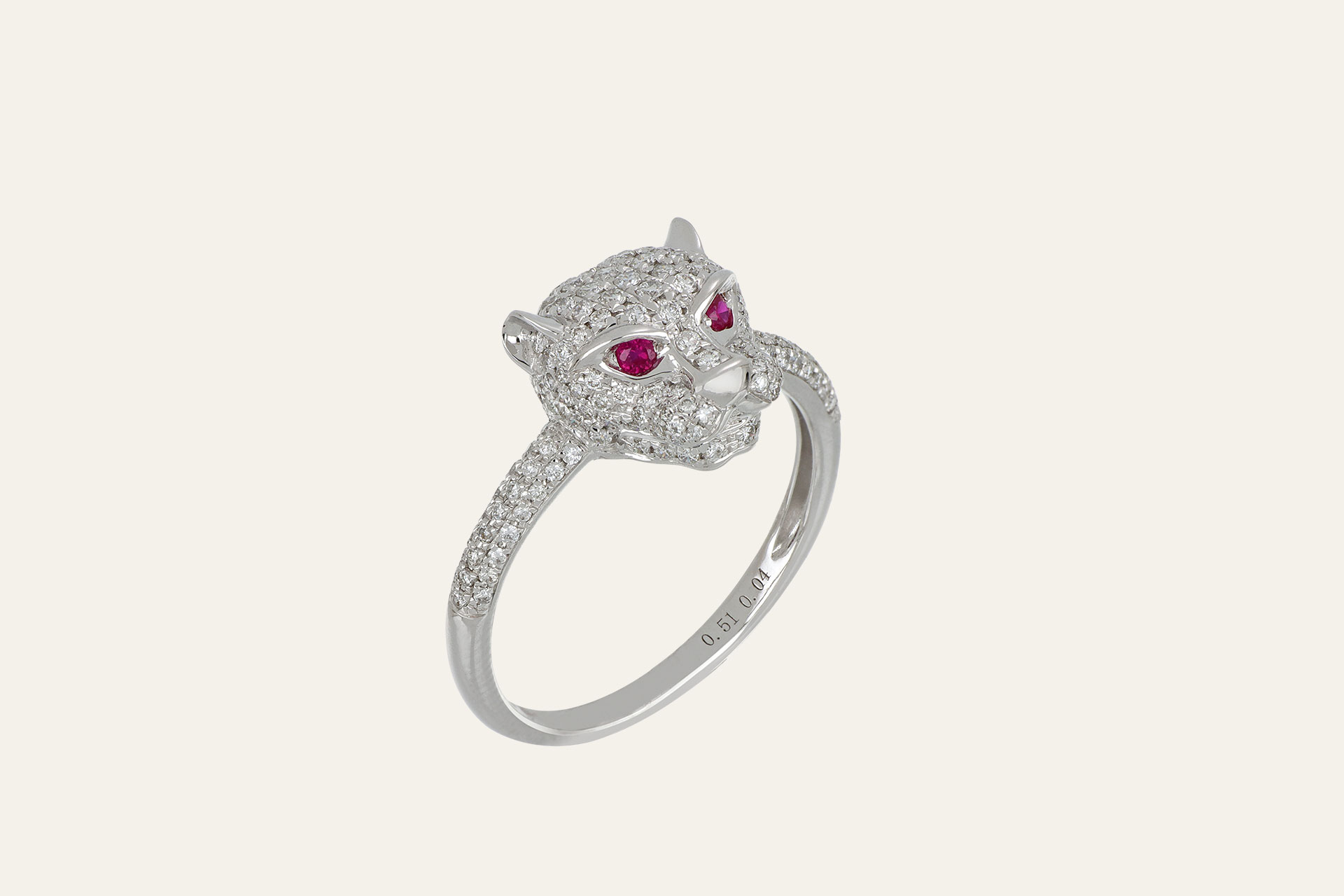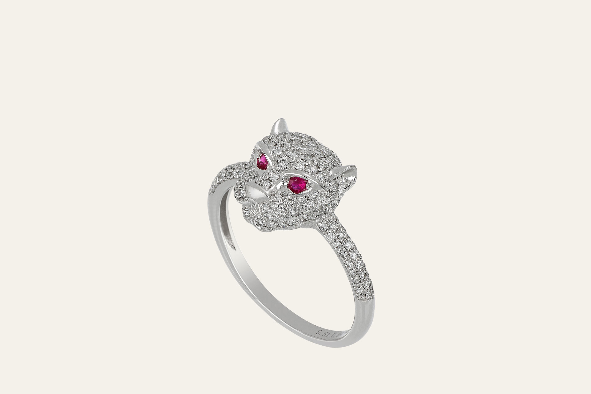 Anello in oro bianco dominato da una elegante testa di pantera. Interamente tempestata da un pavé di scintillanti diamanti taglio a brillante, la pantera prende vita grazie a due intensi rubini taglio rotondo a brillante che ne accendono lo sguardo. Un gioiello audace e di grande fascino.