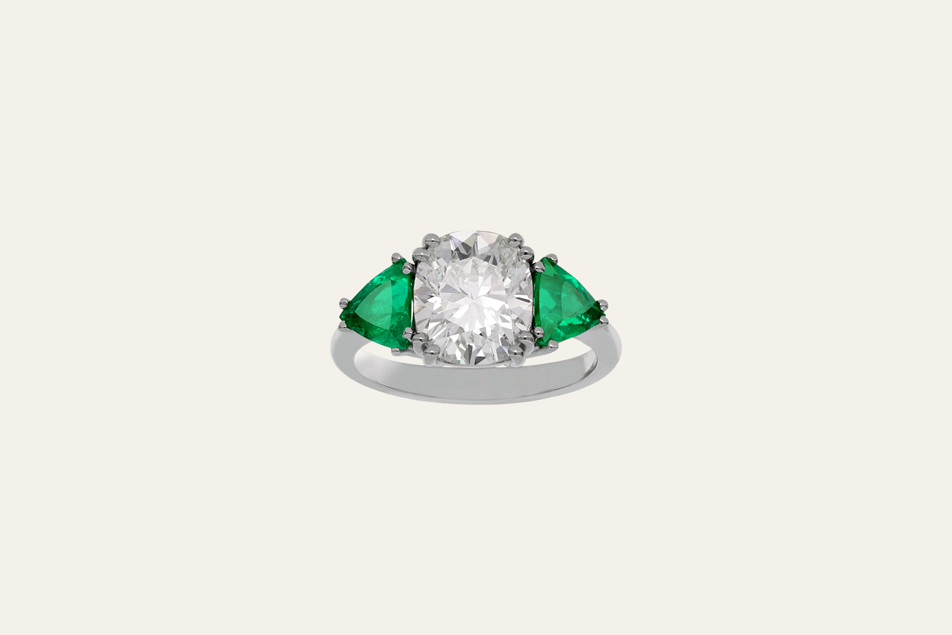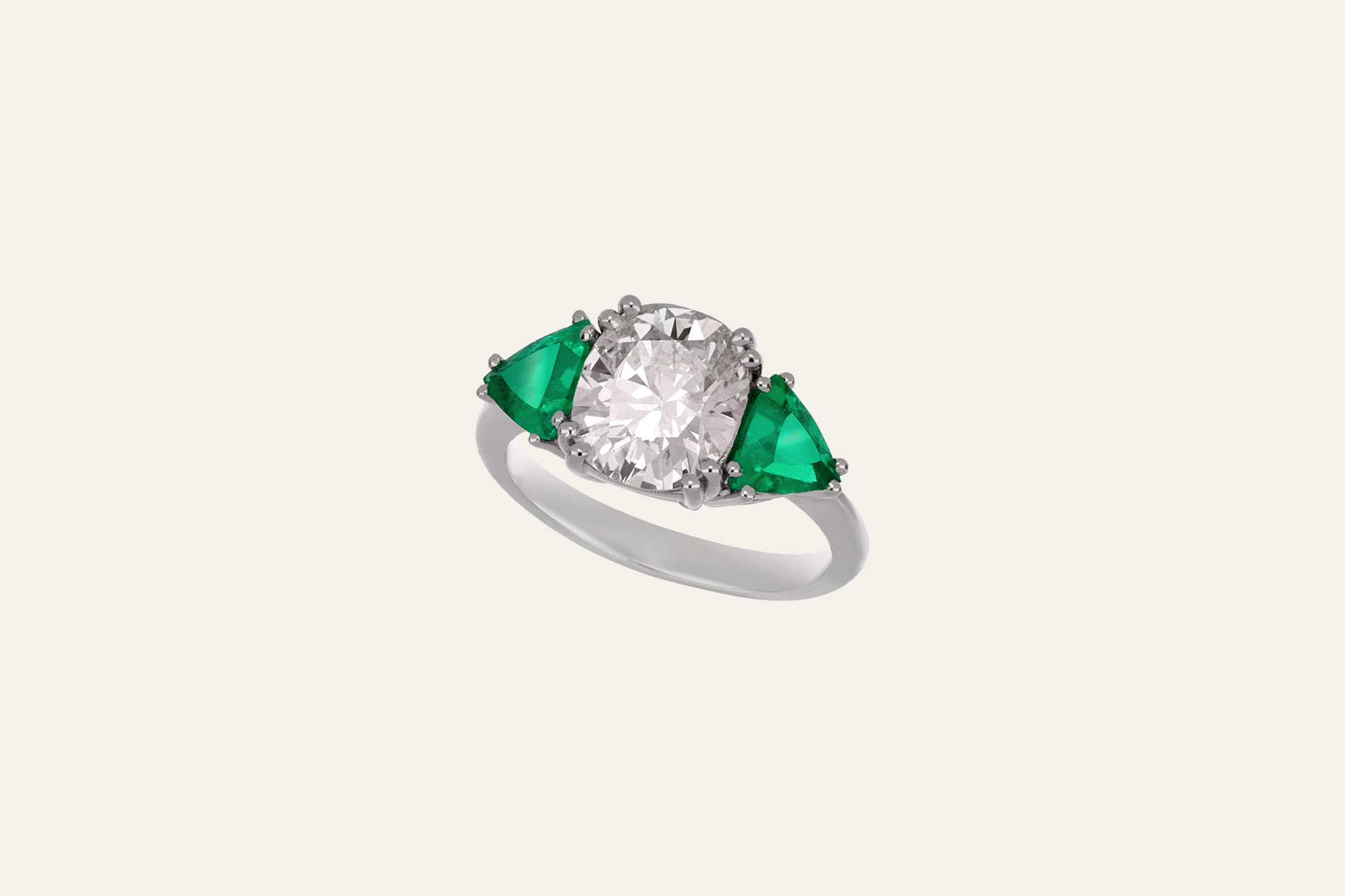 Al centro di questa magnifica creazione risplende un diamante taglio a cuscino (cushion cut), una forma celebre per la sua straordinaria brillantezza e il suo fascino romantico e vintage.  A custodire questa gemma centrale, una coppia di smeraldi naturali taglio a triangolo (trillion cut). Questa scelta di design non è casuale: la loro forma geometrica e moderna crea un contrasto cromatico e stilistico mozzafiato con la morbidezza del diamante. La montatura è stata studiata per esaltare al massimo la purezza e la lucentezza di ogni singola gemma, creando una sinfonia di luce e colore perfettamente bilanciata.