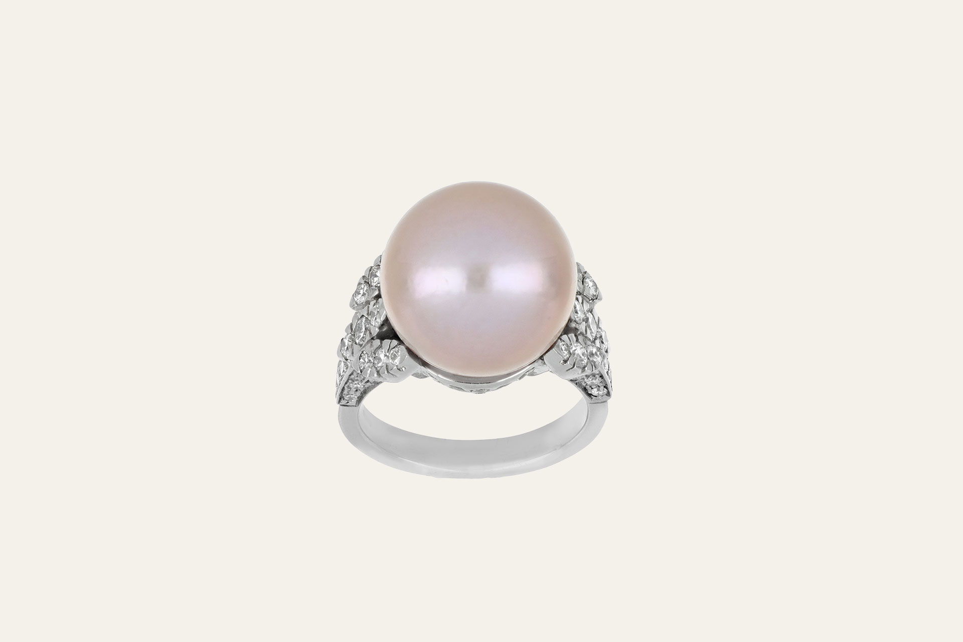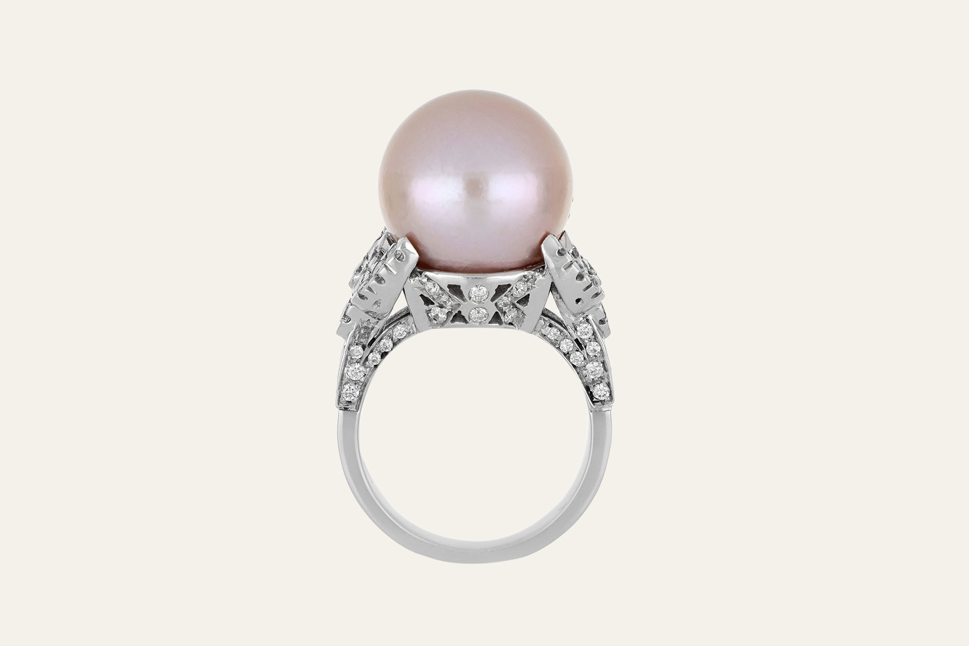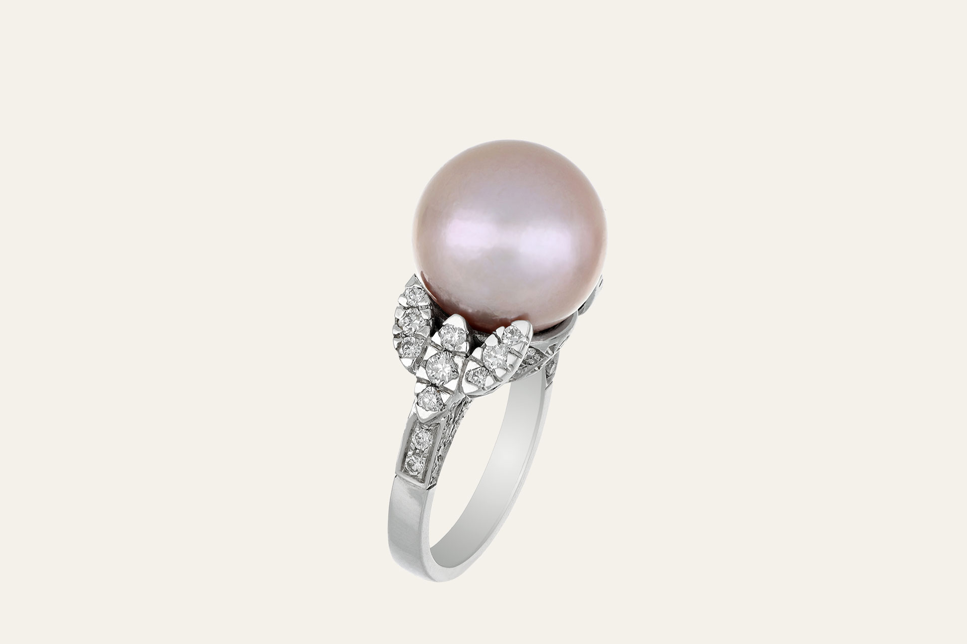 Questo anello è un’ode alla bellezza naturale, dove la delicata tonalità di una perla rosa viene esaltata da una montatura scultorea in oro bianco e dalla brillantezza pura dei diamanti. Un gioiello unico, pensato per chi ama distinguersi con grazia e raffinatezza. Al centro di questa creazione risplende una magnifica perla rosa. La sua superficie liscia e luminosa riflette la luce con sfumature calde e delicate. Ogni perla è selezionata con cura per garantire una forma perfettamente sferica e un lustro eccezionale, rendendo ogni anello un pezzo irripetibile. La montatura in oro bianco è un capolavoro di maestria orafa, incastonata con diamanti taglio a brillante. Due eleganti foglie stilizzate nascono dal gambo dell’anello per creare una culla sicura e armoniosa per la perla.