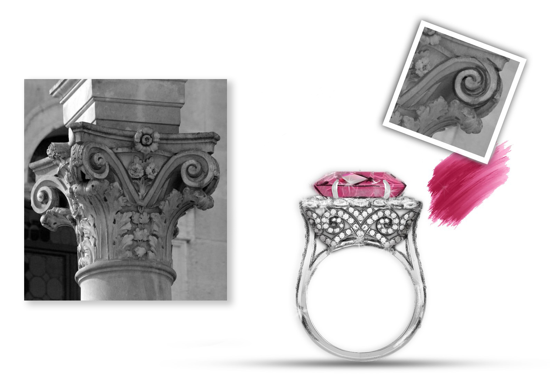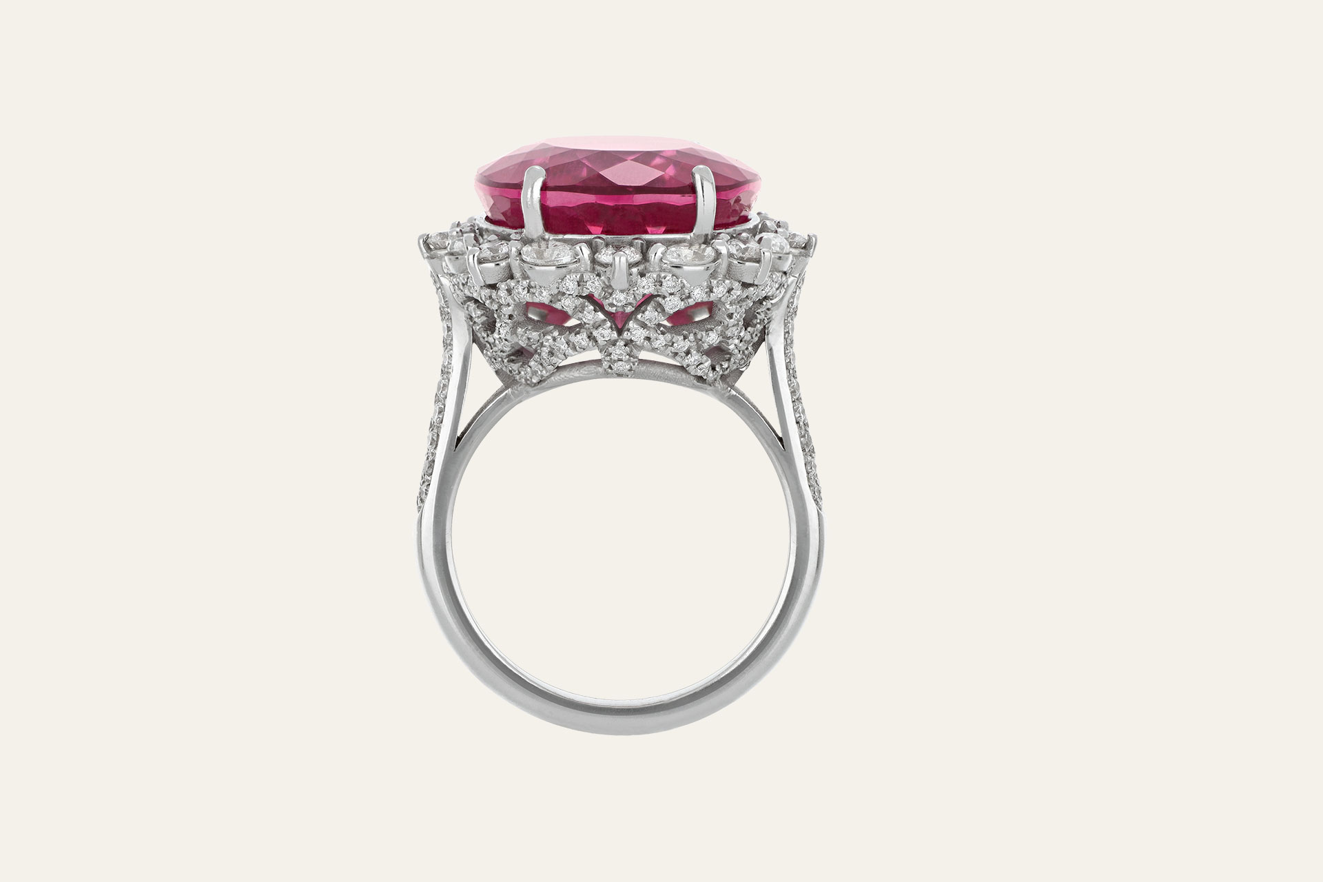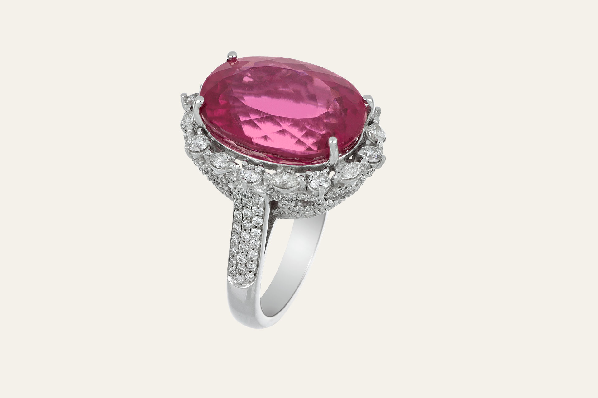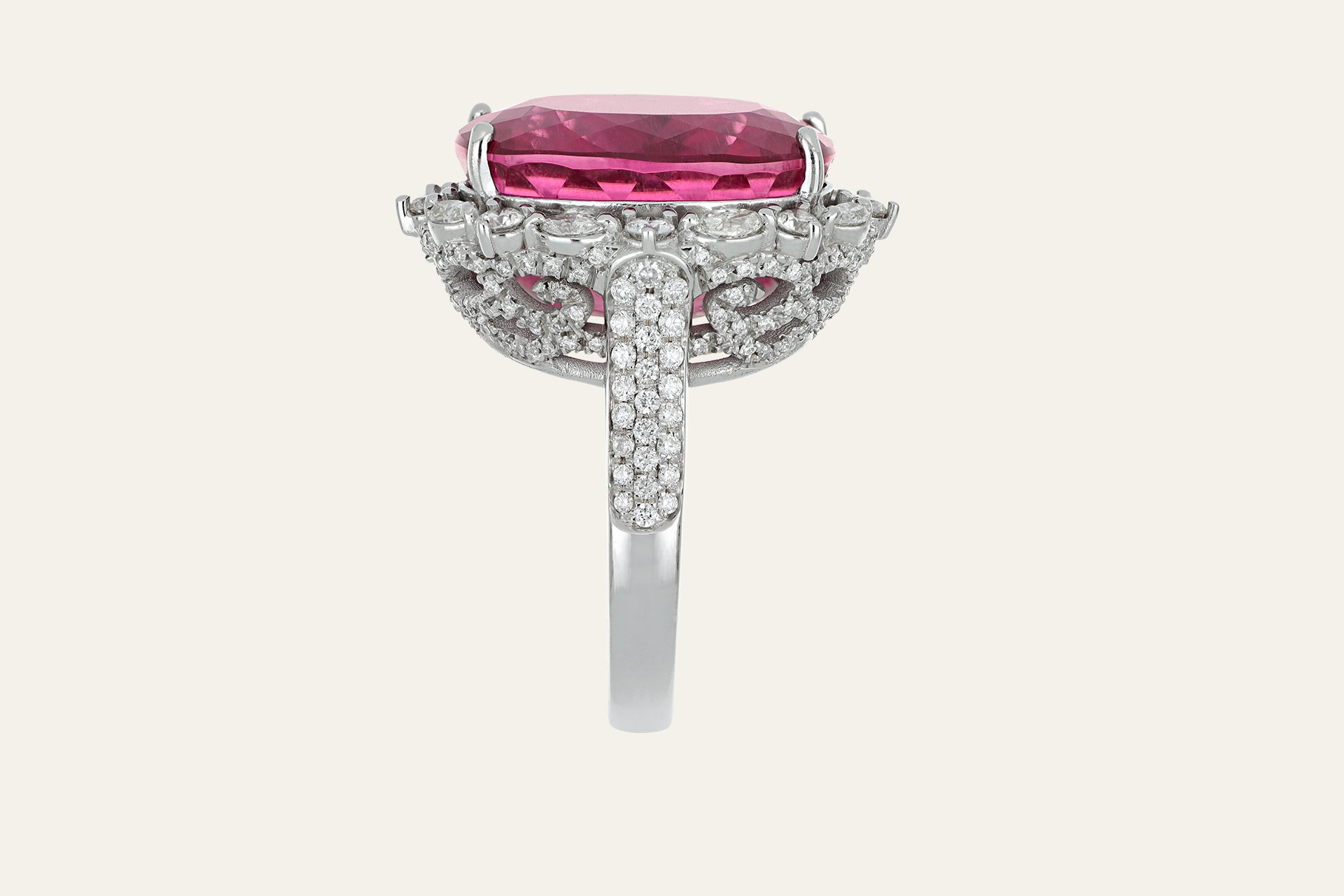 Questo anello in oro bianco è un inno alla bellezza e all’artigianalità. Al centro, una magnifica rubellite taglio ovale cattura lo sguardo con la sua tonalità intensa e profonda, cuore pulsante di questa creazione. Attorno ad essa, una preziosa corolla di diamanti, sapientemente alternati tra l’elegante taglio a navette e lo scintillante taglio a brillante, crea un alone di luce che esalta la gemma centrale. Il castone, un delicato intreccio ramage ispirato alla leggerezza dei capitelli corinzi, è a sua volta tempestato di diamanti taglio a brillante. Infine, il gambo avvolge il dito con un lussuoso pavé di diamanti taglio a brillante, assicurando che ogni angolazione sveli una nuova scintilla. Un capolavoro di design, dove ogni dettaglio racconta una storia di eleganza senza tempo.