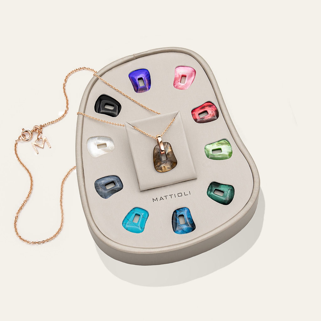 Un versatile kit che include una catena in oro rosa e un ciondolo a forma di puzzle, intercambiabile. Quest’ultimo è proposto in madreperla naturale e in diverse varianti colorate