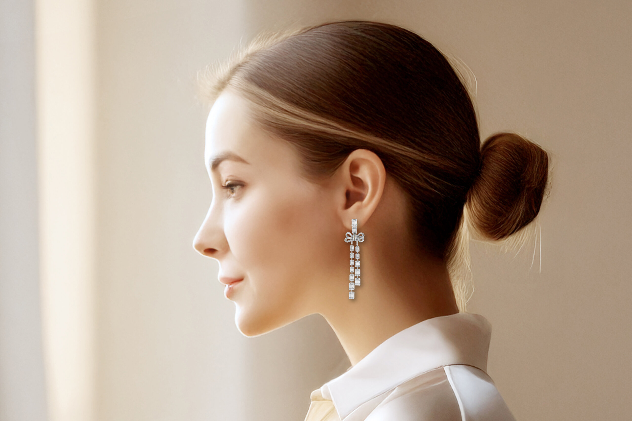 Orecchini pendenti in oro bianco 750/1000 con diamanti taglio a brillante e a baguette.