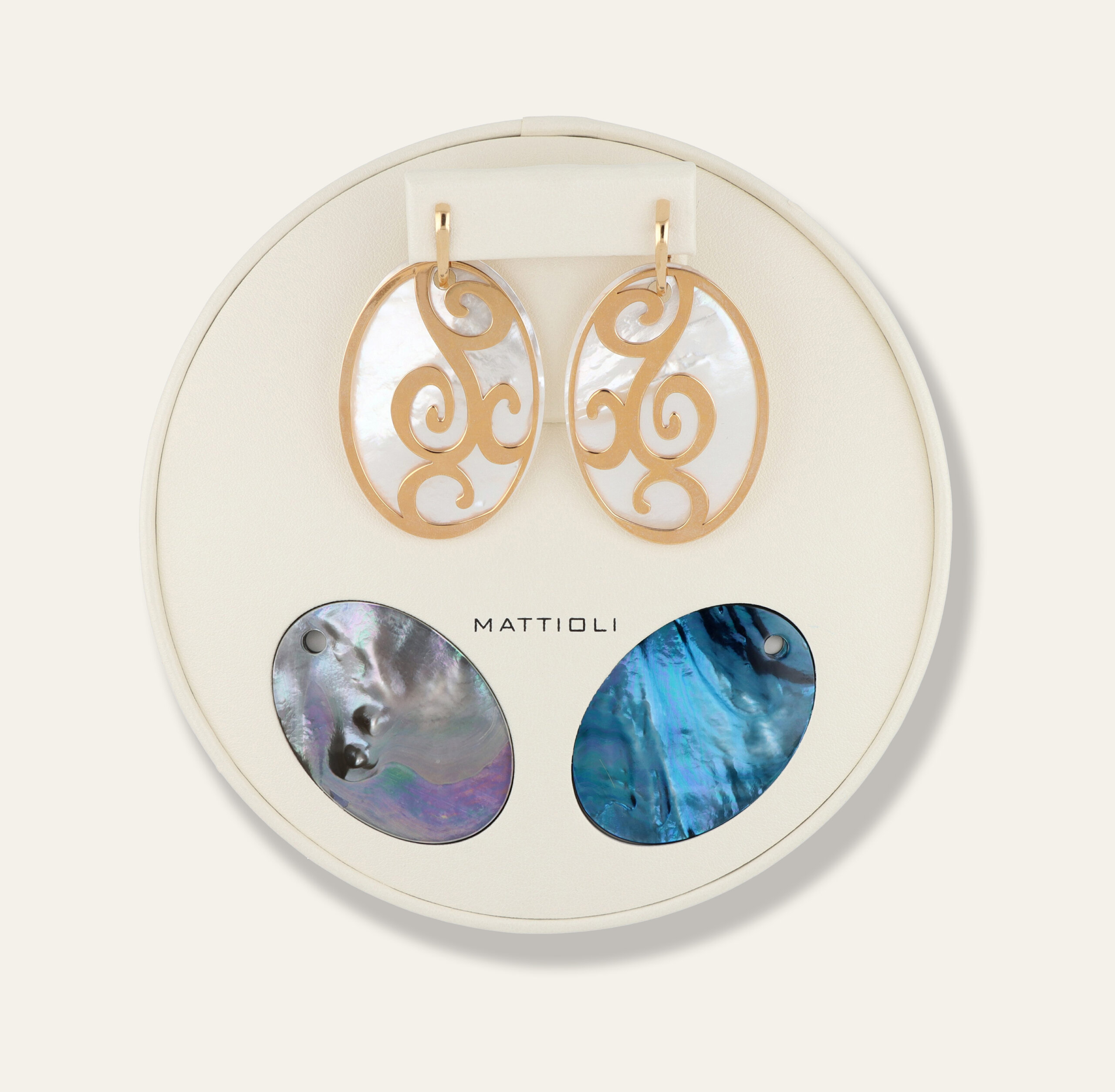 Orecchini in oro rosa, caratterizzati da una pratica anella da cui pende un magnifico ciondolo ovale. Quest’ultimo, anch’esso in oro rosa e finemente traforato, lascia intravedere al suo interno ciondoli di madreperla colorata, creando un suadente e affascinante gioco di luci e riflessi.