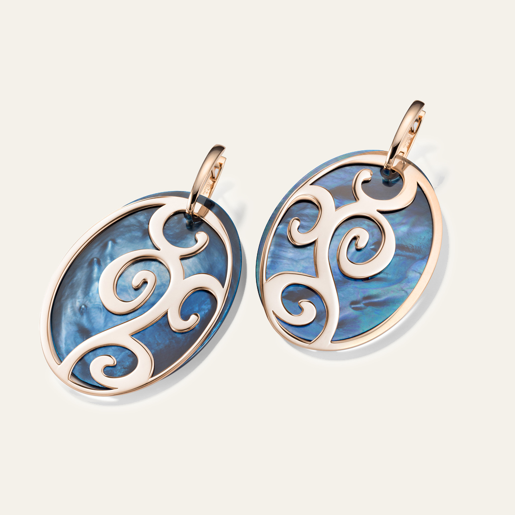 Siriana fra visioni d’Oriente e atmosfere dell’harem. Se attraverso le grate delle sue finestre si proteggeva il fascino delle donne da sguardi indiscreti, così l’oro traforato vela la pietra sottostante, svelando il colore. Intramontabili madreperle colorate utilizzate in abbinamento ad un suadente oro rosa sottolineano lo charme della collezione Siriana.