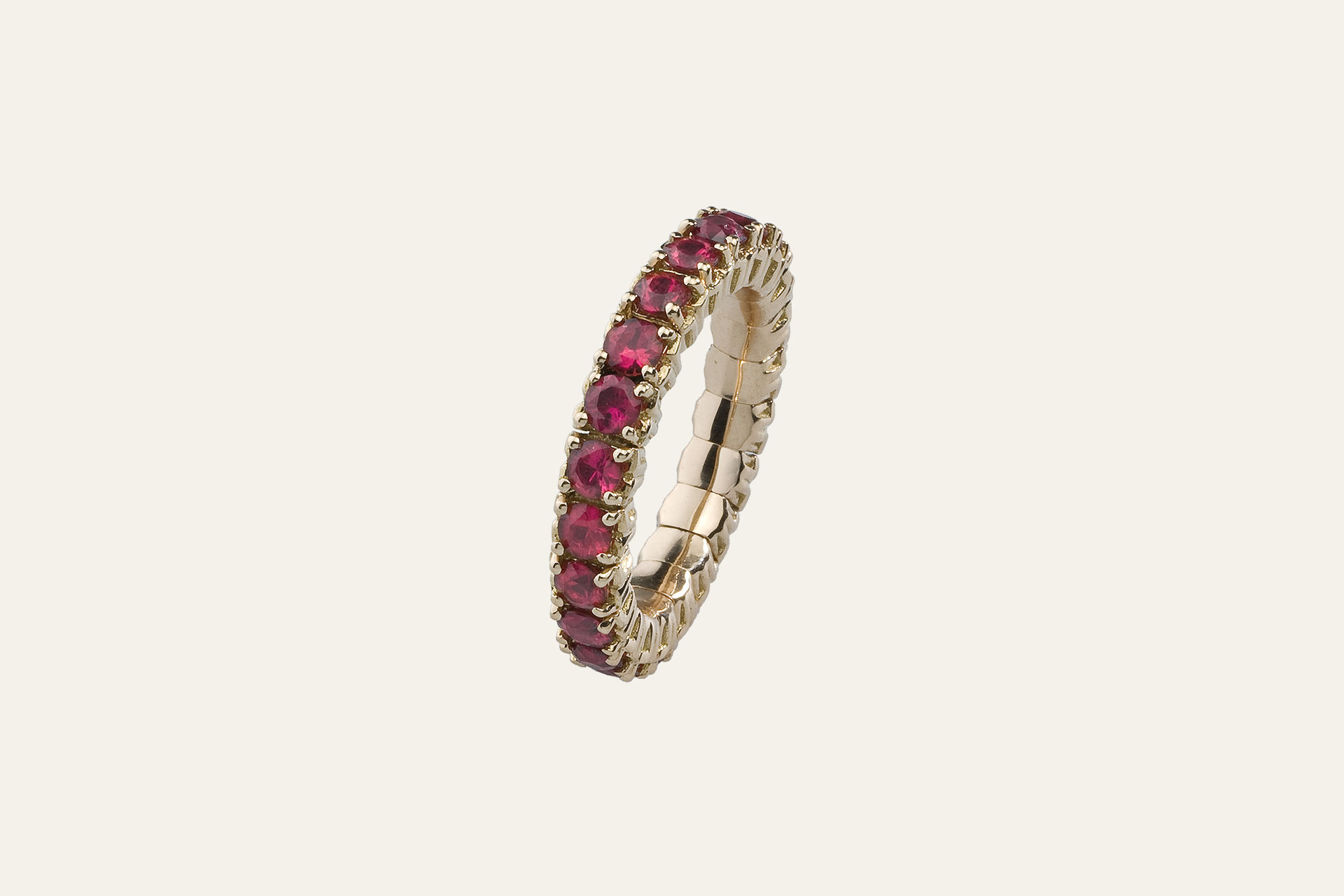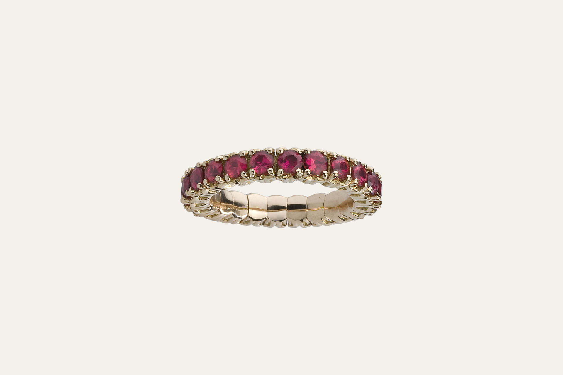 Anello Riviera Eternity in oro rosa, impreziosito da luminosi zaffiri orange taglio rotondo a brillante. L’innovativa montatura elastica garantisce una vestibilità confortevole e perfetta, unendo eleganza e praticità.