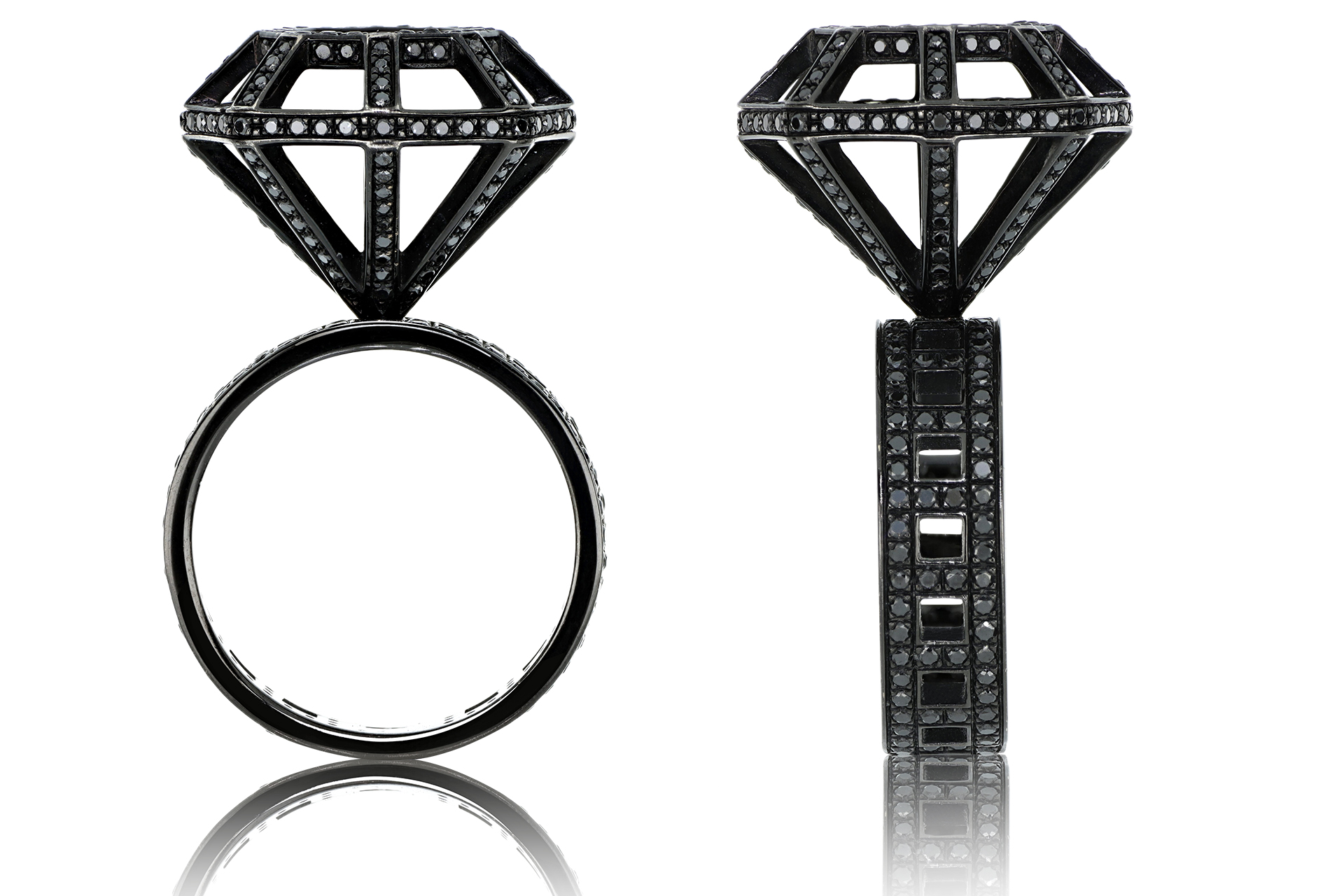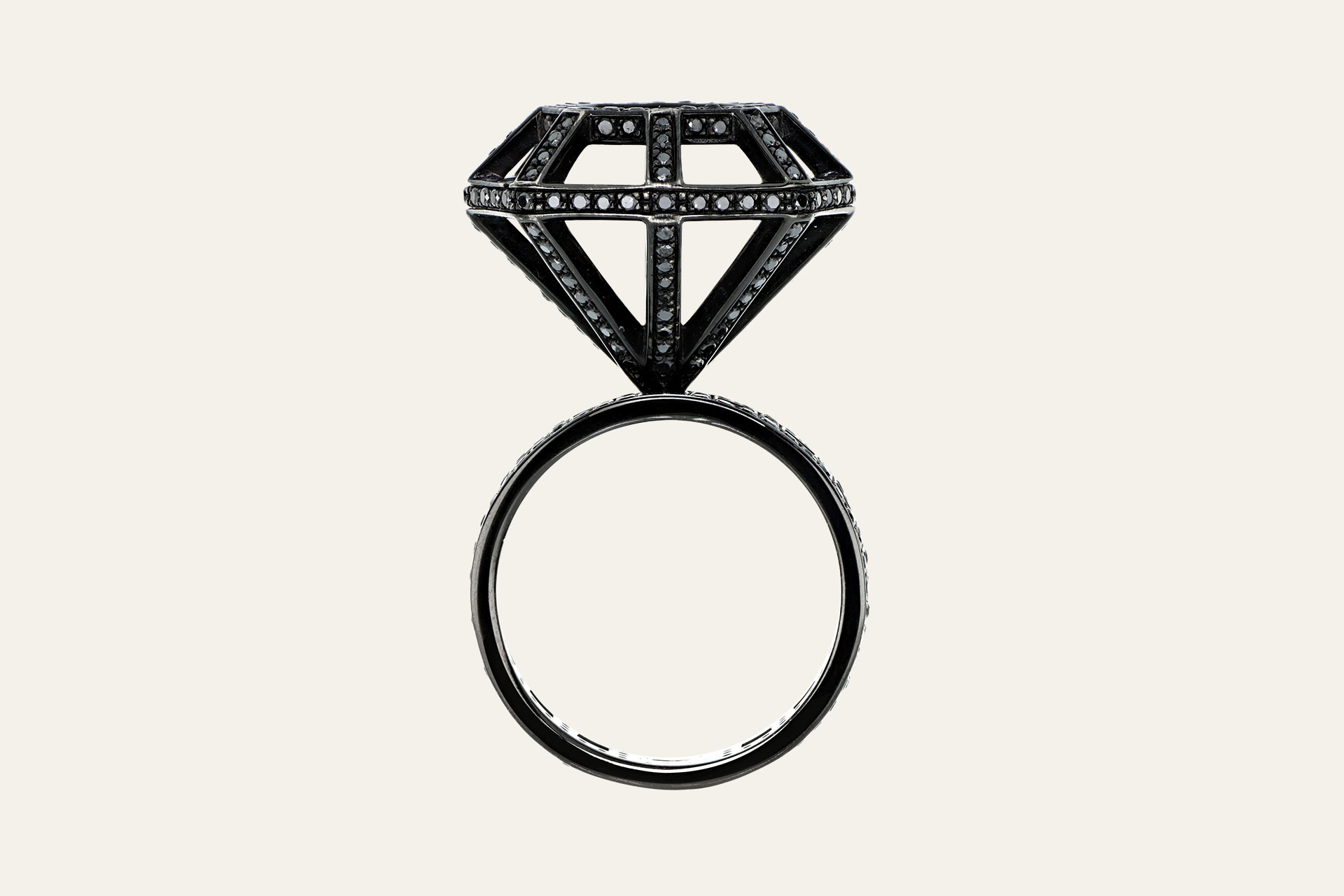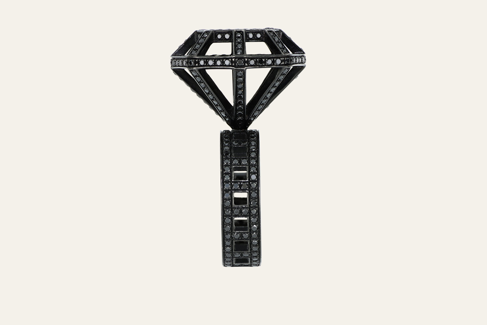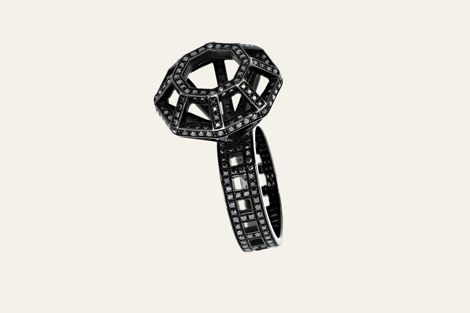 Anello in oro bianco brunito 750/1000 con incastonati 354 diamanti neri taglio a brillante.